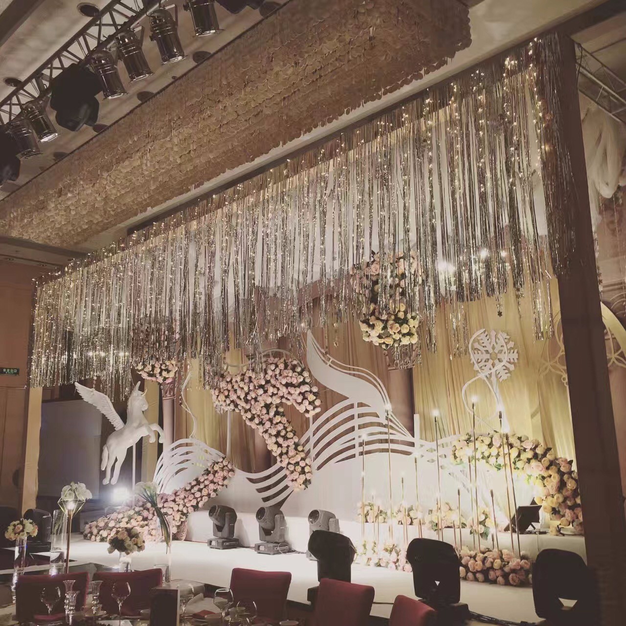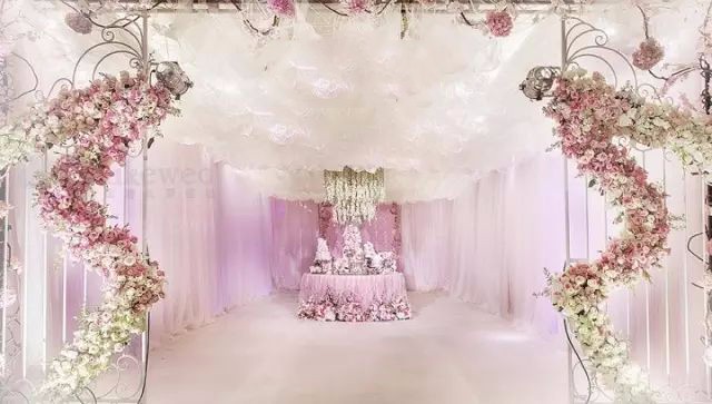 其實(shí)吊頂是可有可無(wú)的,可以根據(jù)自己的結(jié)婚預(yù)算而定。有吊頂?shù)幕槎Y會(huì)顯得更加的奢華隆重,不會(huì)顯得空蕩蕩的。吊頂可以選擇鮮花吊頂,也可以選擇流蘇吊頂,增加主題婚禮的浪漫感。